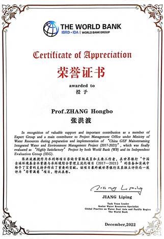 张洪波教授作为水利部世行项目咨询专家组成员,一直参与中国全球环境基金水资源与水环境综合管理主流化项目的技术咨询与研究工作。鉴于其积极作用和重要贡献,世界银行特发证予以肯定。而这标志着近年来公司持续在国家留学基金委创新型人才国际合作项目、国别区域研究人才支持计划、科技部外国专家项目等国际合作领域取得重要进展的同时,在参与国际重大科学研究计划方面也提升显著。