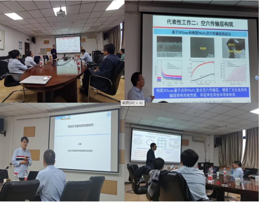 侯军刚教授以“太阳能光催化光生电荷调控”为主题,从光生电荷活性位点策略、空穴传输层策略、多尺度协同策略方面总结展示了相关工作。同时指出通过微纳结构催化材料集成体系的构筑、能带结构调控、电荷传输与催化反应体系等交叉研究,有望为能源催化的高效转化提供新思路。侯军刚教授讲解生动有趣,引人入胜,不仅带来了一场精彩的学术大餐,而且还通过论文分析等讲解了如何将工作做的更加深入、更加全面。侯军刚教授严谨的论证、渊博的知识、风趣的语言给各位老师和员工留下了深刻的印象。