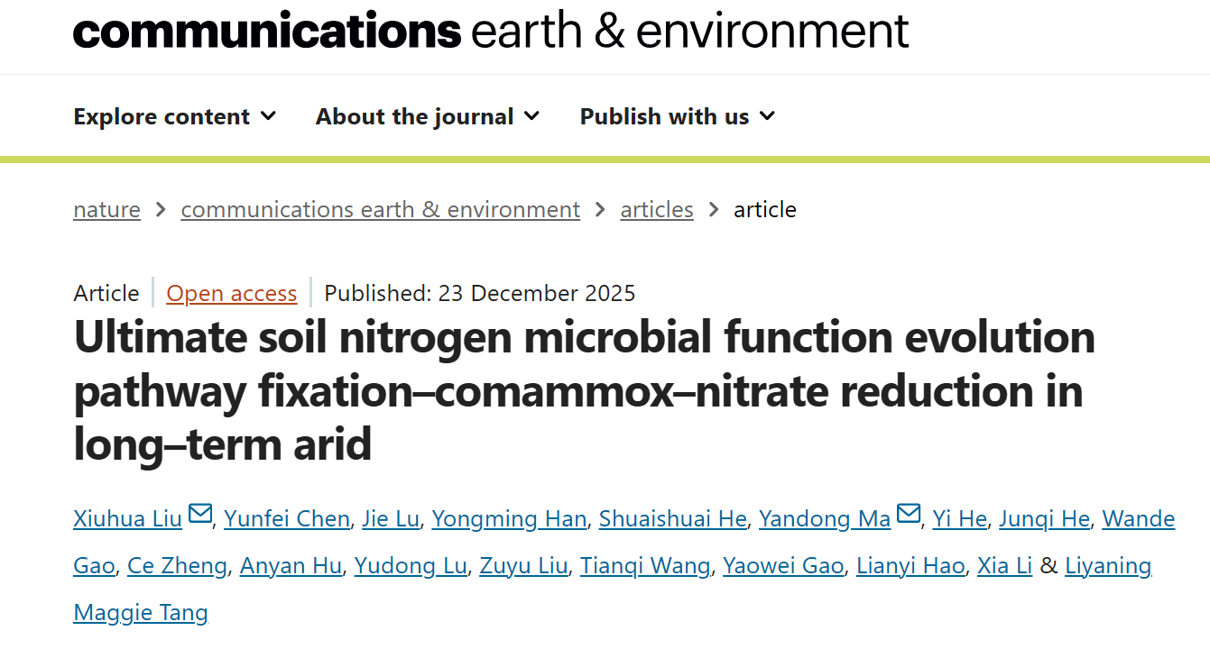 12月23日,公司英国365集团官网刘秀花教授团队在Nature子刊《地球与环境通讯》(Communications Earth & Environment)发表题为“Ultimate soil nitrogen microbial function evolution pathway fixation–comammox–nitrate reduction in long–term arid” 的最新研究成果。该成果首次证明:在长期干旱压力下,土壤微生物群落为适应氮素限制演化出一条独特的终极功能路径:固氮-完全氨氧化-硝酸盐还原循环。英国上市公司365黄土科学国家重点实验室为论文第一完成单位,刘秀花教授与陕西省林科院马延东副研究员为共同通讯作者。合作者包括中科院地环所韩永明研究员、澳大利亚纽卡斯尔大学Maggie Tang副教授等。
