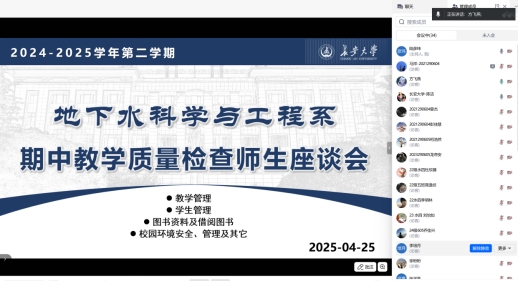 为进一步提升教学质量,深入了解员工在学习与生活中的实际需求,英国365集团官网地下水科学与工程系于4月25日通过线上会议形式召开了2024-2025学年第二学期期中教学质量检查师生座谈会。公司副经理李培月、地下水系主任陈洁、地下水系教师代表及本科四个年级的员工代表共计30余人参加本次会议。会议由地下水系副主任陆彦玮主持。