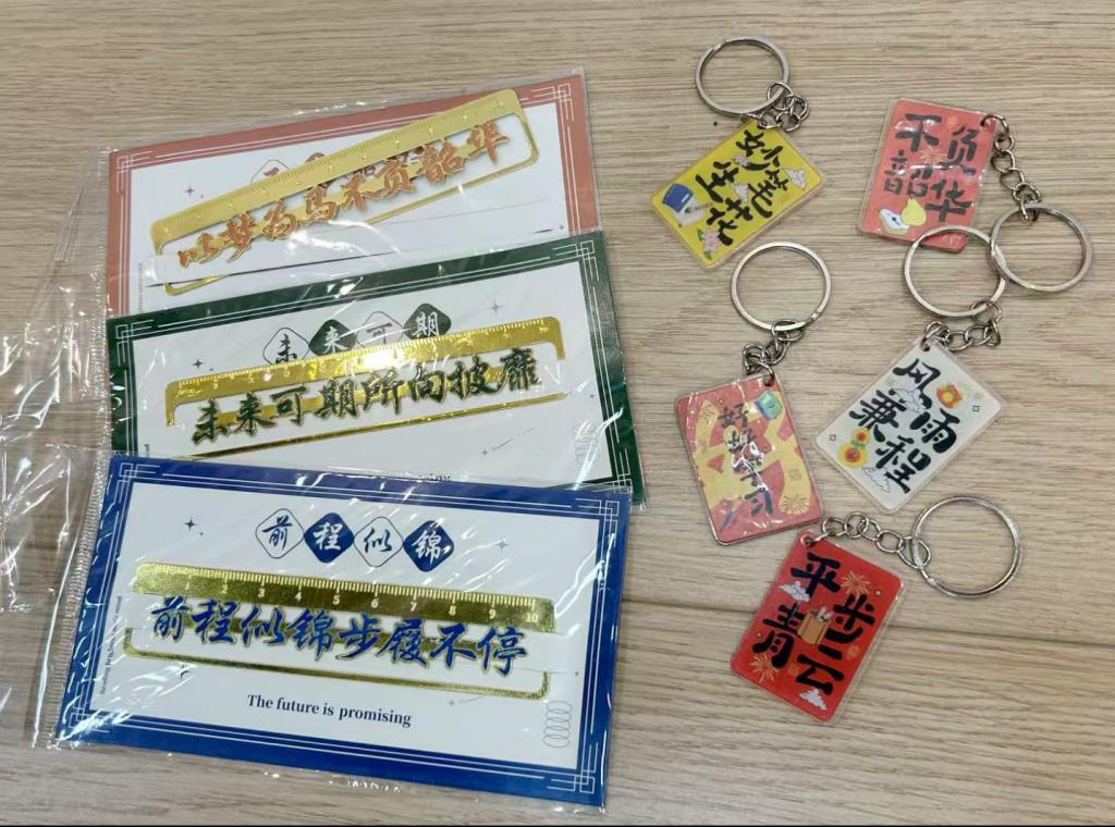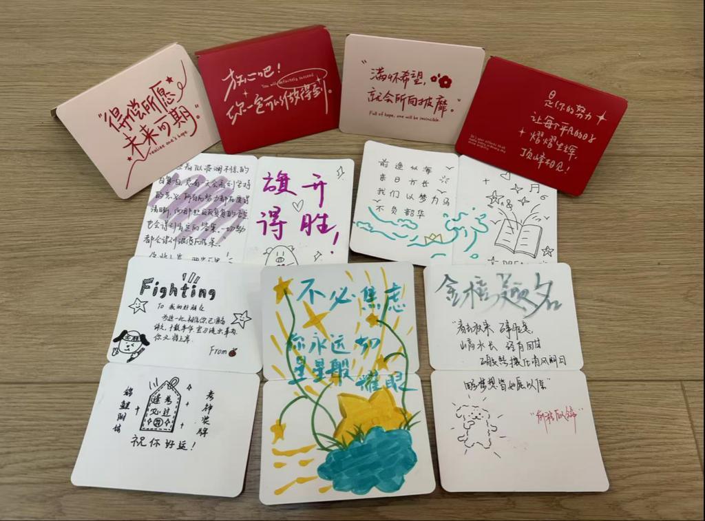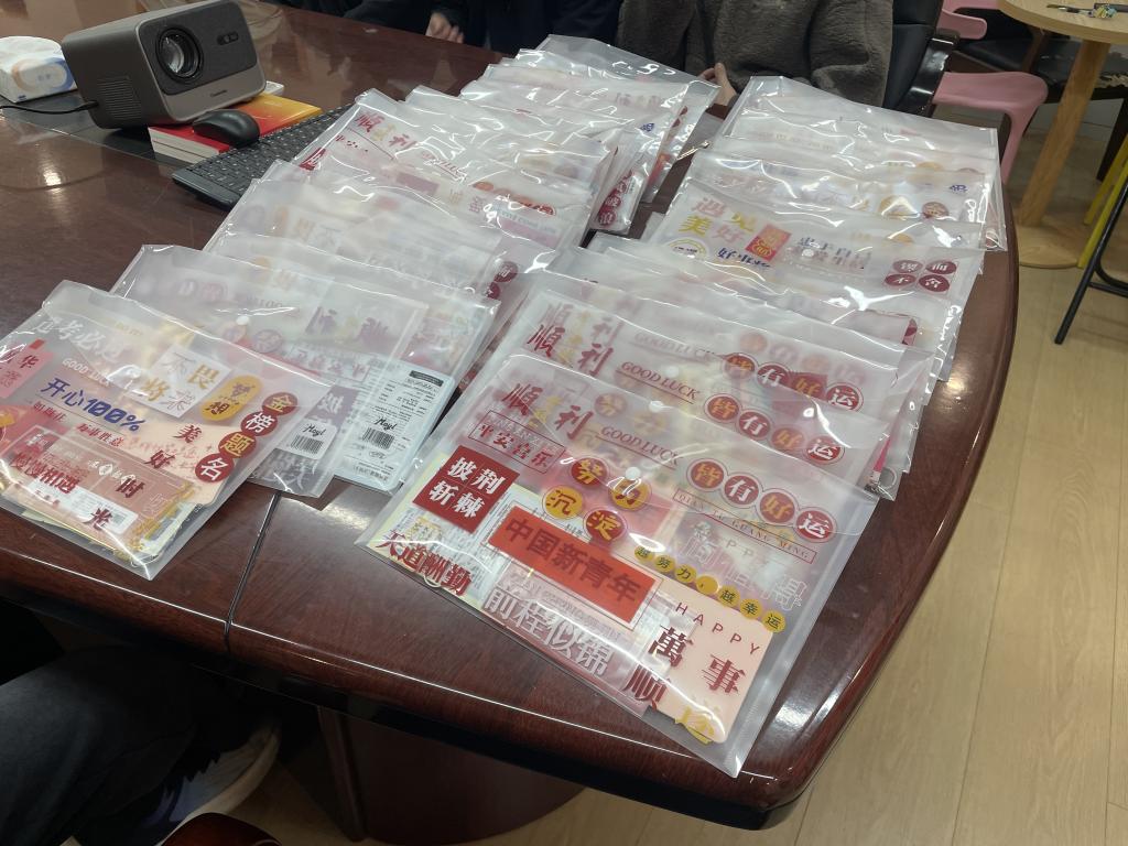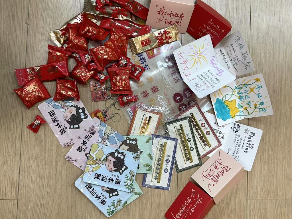 为助力考研学子全力冲刺、圆梦考场,公司精心筹备的"考研加油包"满载温情。礼包中包含公司领导班子、系室主任、教工党支部书记、辅导员及学弟学妹们亲手书写的祝福贺卡;“天道酬勤”励志书签,以隽永文字时刻勉励追梦人;甜蜜糖果,将“金榜题名”的美好祝福融进舌尖;舒缓眼贴,为疲惫的眼眸送上片刻放松;还有刻着“前程似锦”字样的定制钥匙扣,寓意开启通往理想学府的大门。从精神慰藉到实用助力,这份礼包全方位为考研学子保驾护航。